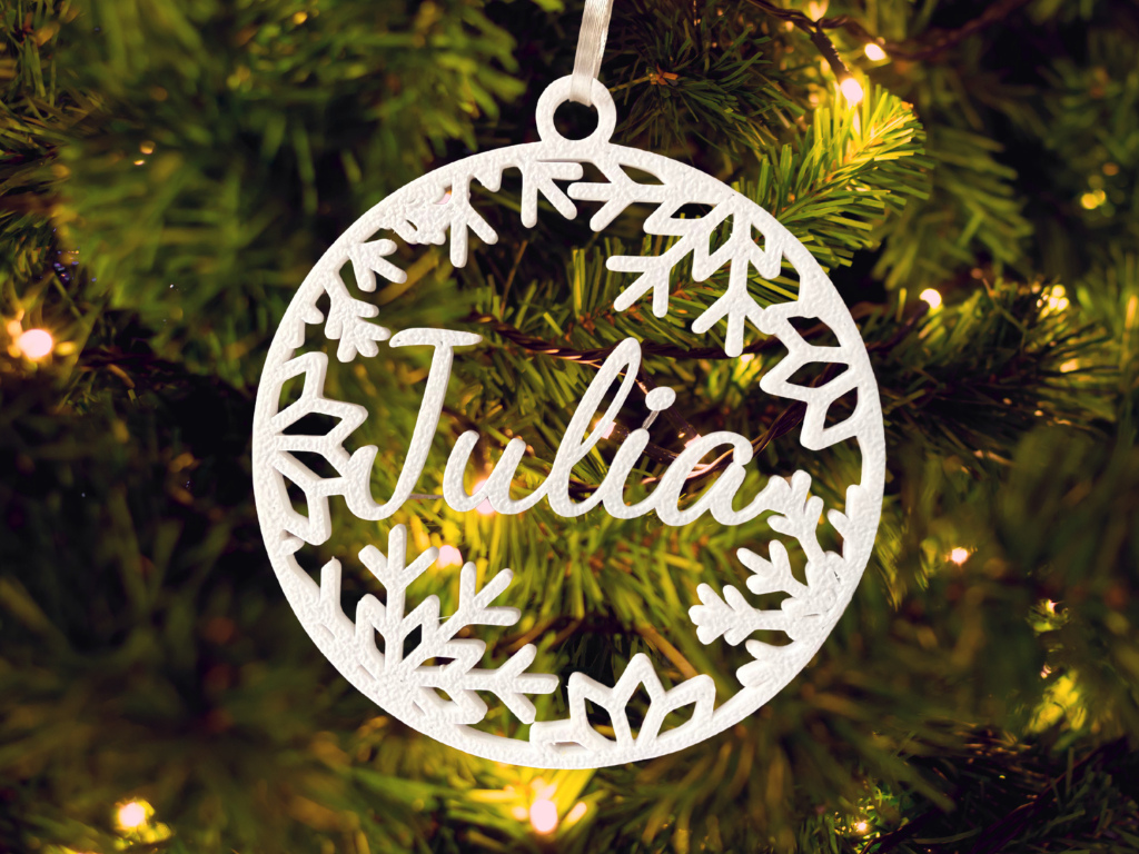 Hver julekule lages på bestilling med det navnet du ønsker, og blir en helt unik dekorasjon – perfekt som gave, julepynt eller minne til familien.