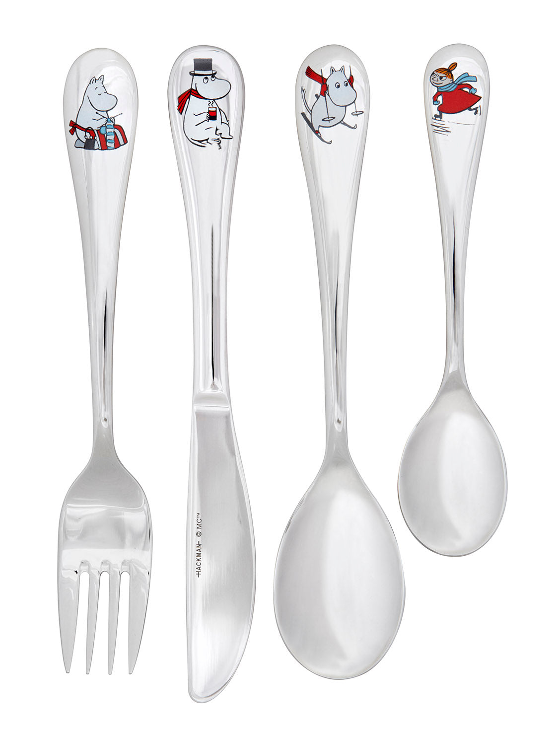 Gjør måltidene morsommere og mer motiverende for de minste med dette nydelige Mummi barnebestikket fra Hackman. Settet består av fire deler: skje, gaffel, kniv og teskje – alle i barnevennlig størrelse og dekorert med fargerike Mummimotiver som Lille My på skøyter, Mummitrollet, Mummipappa og Mummi på ski.