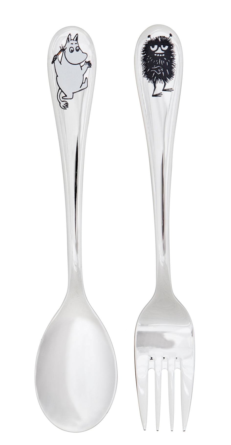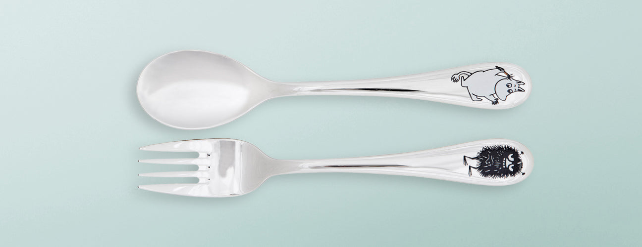 Bestikket er laget i slitesterkt rustfritt stål og tåler daglig bruk, oppvaskmaskin og småbarnsliv. Perfekt som gave til dåp, babyshower eller som en koselig overraskelse til en liten Mummifan.